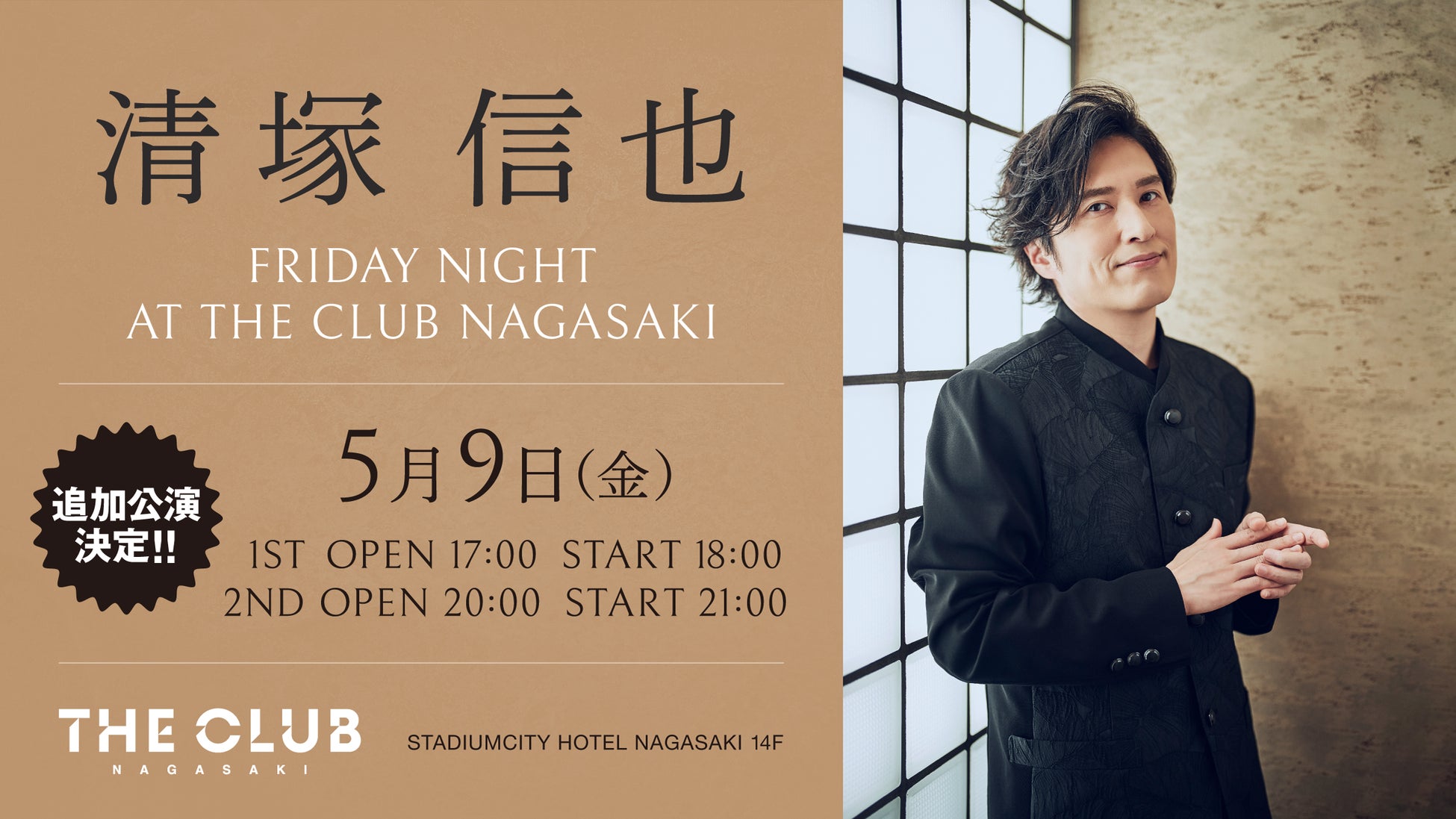 5月10日(土)の「清塚信也 PREMIUM NIGHT AT THE CLUB NAGASAKI 」が完売となりましたことをご報告するとともに心より御礼申し上げます。大変多くのお申し込みと反響を頂戴したことを受け、急遽、なんと前日5月9日(金)に追加公演を行うことを決定いたしました!