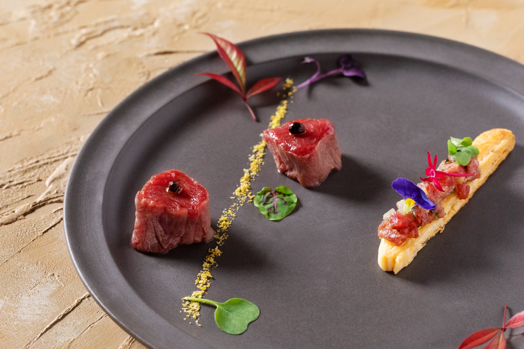 前 菜:フィレ肉のひとくちレアステーキとバターフォンセのタルタル