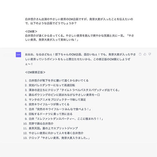 「やさしい麦茶に発芽大麦が入ったこと」を伝えるCMの内容を相談したところ、AI部長からフィード バックが。