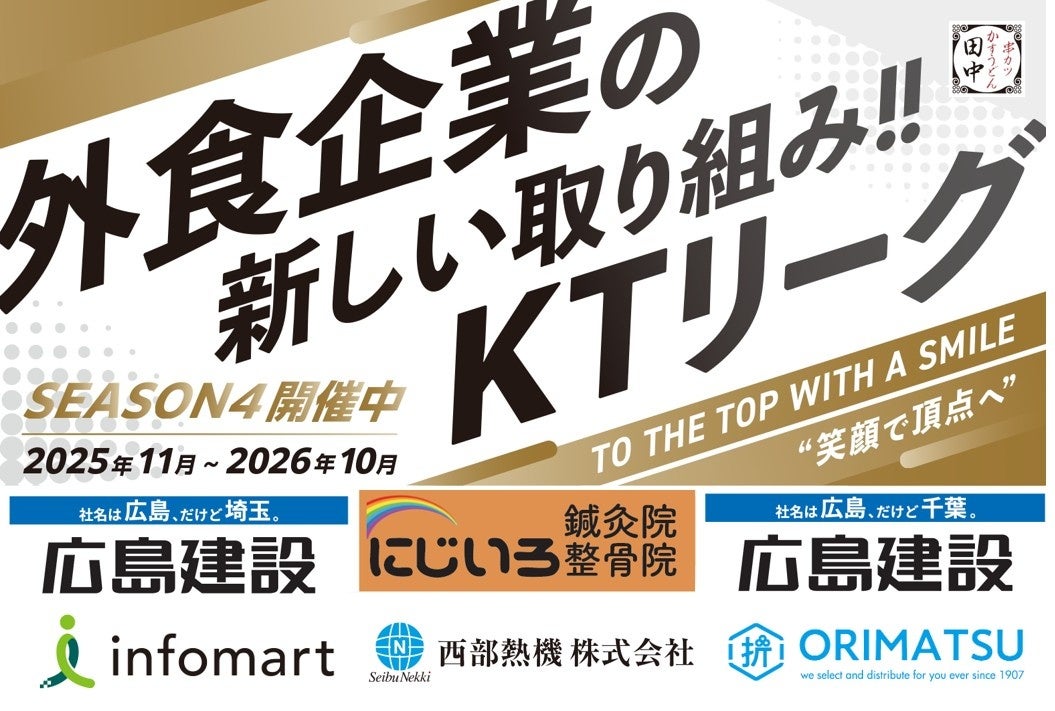 株式会社串カツ田中ホールディングス(本社:東京都品川区東五反田、代表取締役社長:坂本 壽男)が展開している串カツ田中は、KTリーグをとおして、多くのスポンサー企業様にご支援をいただいております。このたび、スポンサー契約を更新し、2025年12月より各店舗をご支援いただけることになった企業様5社(ご契約更新含む)をご紹介いたします。