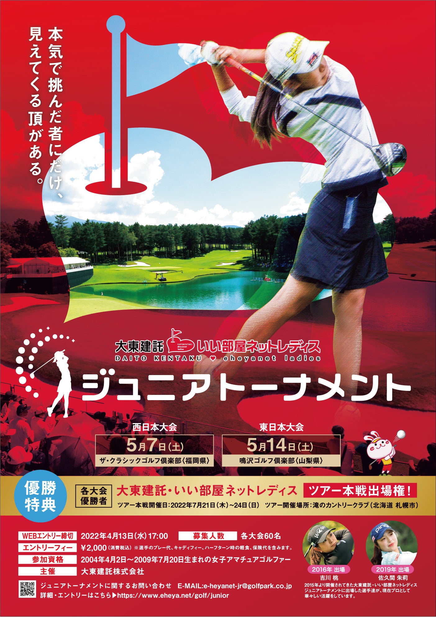 大東建託株式会社(本社:東京都港区、代表取締役社長:小林克満)は、5月7日と14日、13歳から18歳の女子アマチュアゴルファーを対象としたゴルフトーナメント「大東建託・いい部屋ネットレディス ジュニアトーナメント(以下、ジュニアトーナメント)」を開催します。