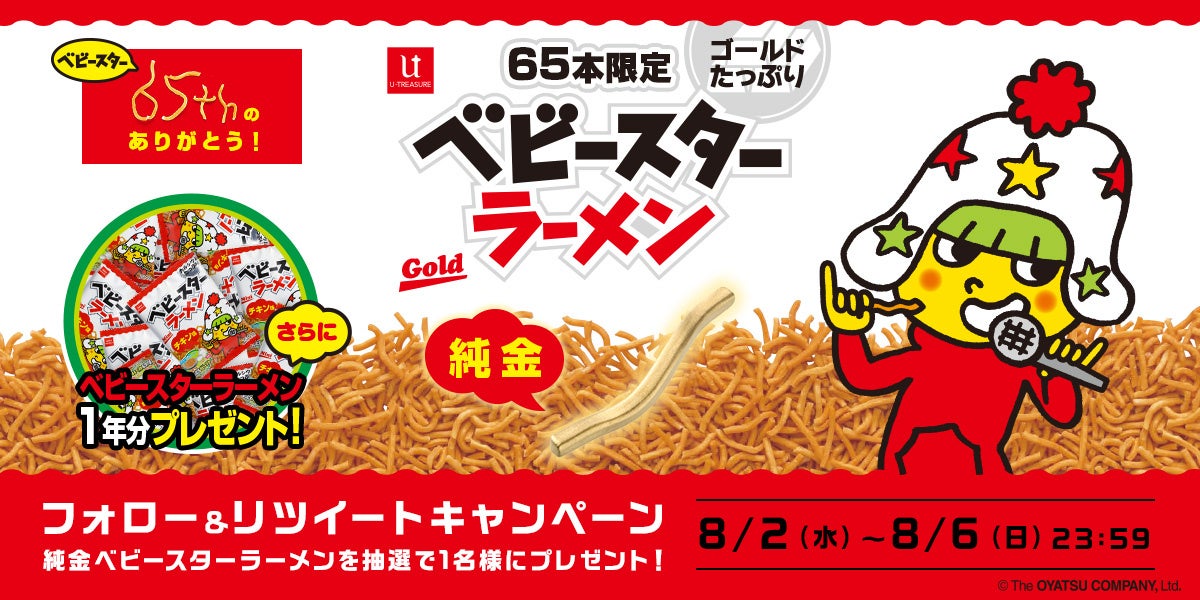 65年目をお祝いしたTwitterキャンペーン開催。ゴールドたっぷり『純金製ベビースターラーメン』1/1サイズ。ベビースターラーメン1年分とセットでプレゼント