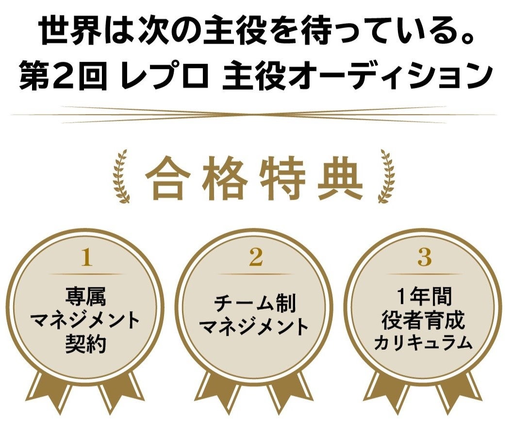 レプロ創立30周年を記念して行われた役者特化型オーディション。本気で役者として「主役」になりたい人を募集する俳優オーディションとして、第2回の開催が決定。合格者はレプロと専属芸術家契約を結び、合格者のために用意された「1年間役者育成カリキュラム」にて、“主役”を目指す役者としてのワークショップや経験を積むことができます。