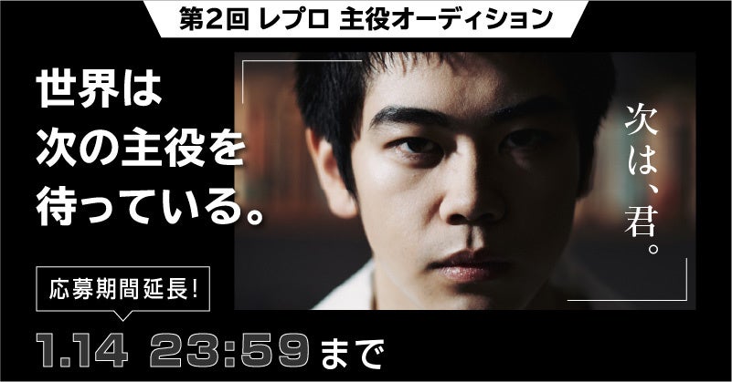 「レプロ 第2回 主役オーディション」におきましては、大変多くの方々にご応募いただき、スタッフ一同感謝しております。応募締切後に、多数のお問い合わせをいただきスタッフで協議をしました結果、応募期間の延長をさせていただくことになりました。募集期間は、2024年1月10日(水)10:00~1月14日(日)23:59までの5日間限定で開催させていただきます。
