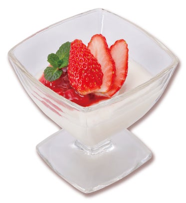 やさしい甘味のミルクプリンに果肉入りの甘酸っぱいいちごソースをかけた王道のプリン