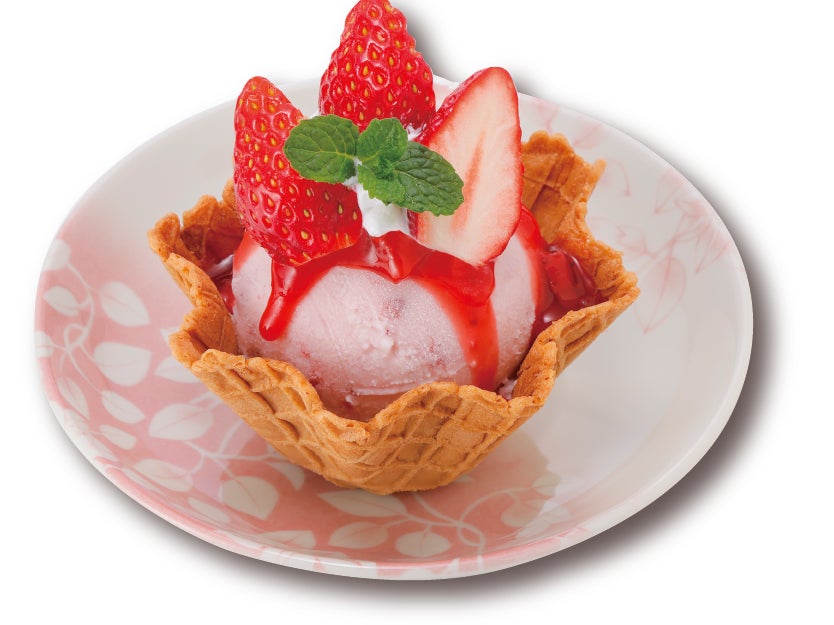 果肉入りの苺のアイスに甘酸っぱいいちごソースとフレッシュのいちごを添えました。