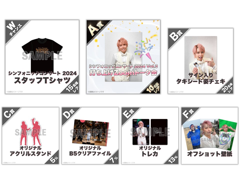 このくじは、株式会社Tixplusが提供しているサービス『くじプラ』を活用し、『シンフォニックコンサート 2024 Vol.3 打ち上げZoomトーク会』や『サイン入り タキシード姿チェキ』など豪華賞品をご用意しております。
