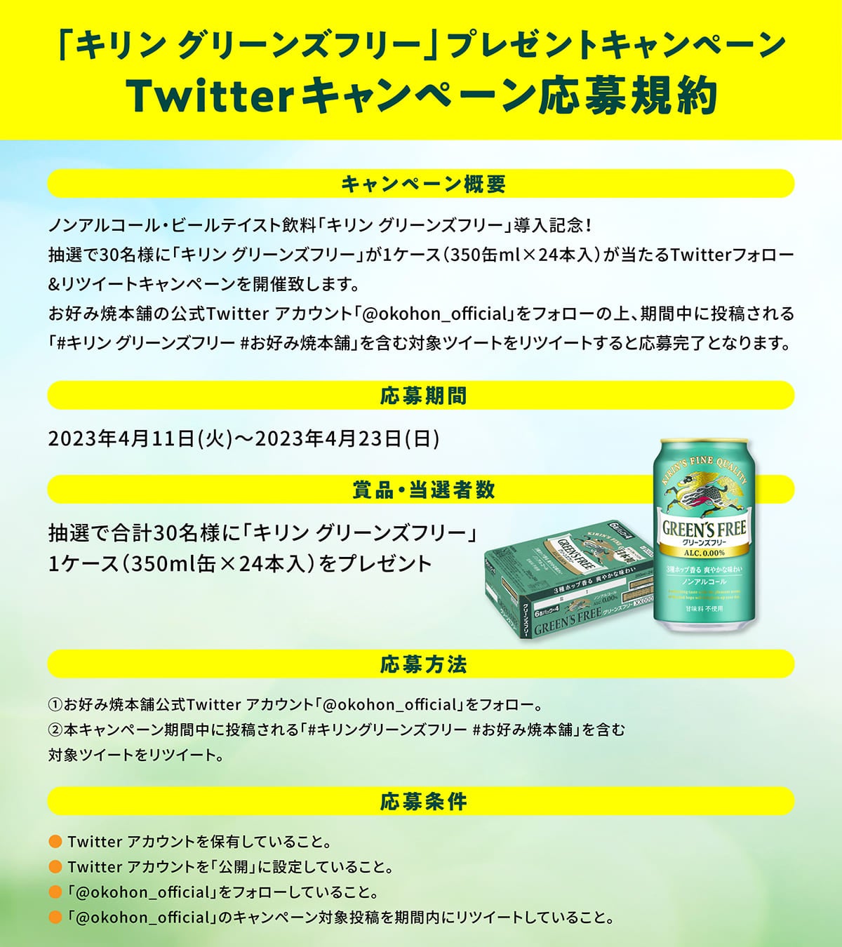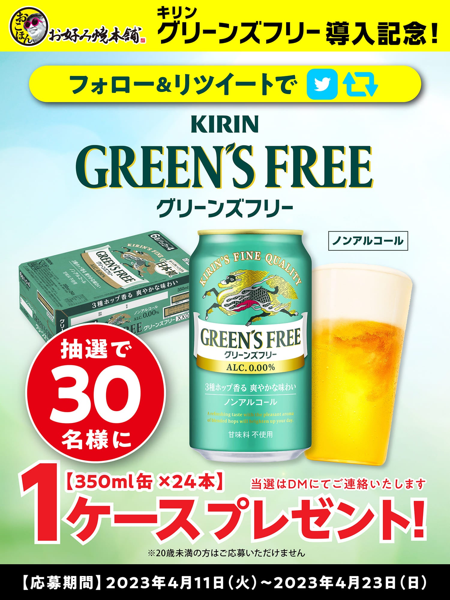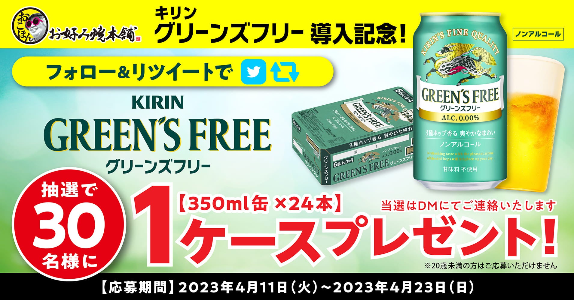 【お好み焼本舗】抽選で「キリン グリーンズフリー」が1ケース当たる!プレゼントキャンペーン開催