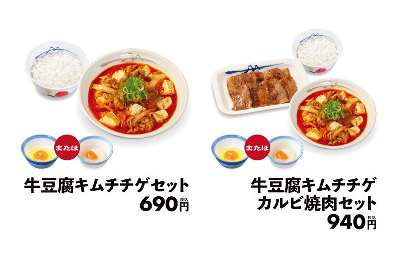 商品名 牛豆腐キムチチゲセット 690円 牛豆腐キムチチゲカルビ焼肉セット 940円 牛豆腐キムチチゲ単品 490円 ※牛豆腐キムチチゲセットを店内でお買い求めのお客様でみそ汁をご希望の方は、従業員にお申し付けください。 ※お持ち帰りいただけます。 ※税込み価格です。 ※株主優待券は上記全てのメニューにご使用いただけます。 ※沖縄店舗は自社製富士山豆腐ではなく、沖縄の島豆腐専門店が作った絹ごし豆腐を使用しています。 発売日 2023年11月21日(火)午後3時 ~ 対象店舗 一部店舗を除く全国の松屋 |
