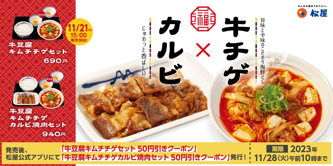 11月21日15時~11月28日10時まで、「牛豆腐キムチチゲセット」「牛豆腐キムチチゲカルビ焼肉セット」の50円引きモバイルクーポンを「松屋フーズ公式アプリ」にて配信いたします。