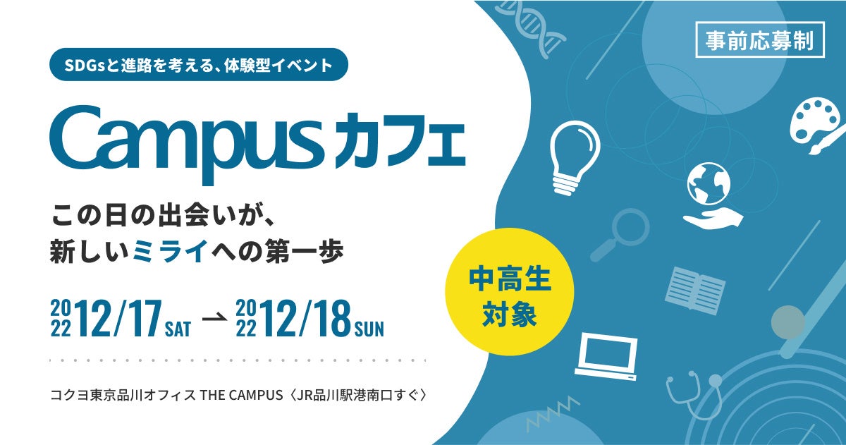 コクヨ株式会社(本社:大阪市/社長:黒田 英邦)は、自ら新しい学びに向かう中高生を支援する体験型イベント「Campusカフェ」を、12月17日(土)、18日(日)の2日間、東京・港区のコクヨ東京品川オフィス「THE CAMPUS」で開催します。11月24日(木)から12月12日(月)まで先着順にて申し込みを受け付けます。