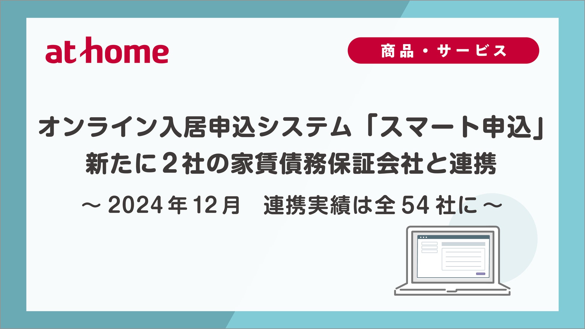 不動産情報サービスのアットホーム株式会社(本社:東京都大田区 代表取締役社長:鶴森 康史 以下、アットホーム)は、賃貸物件の入居申込をオンライン上で行える「スマート申込」において、新たに株式会社アドヴェント(本社:東京都豊島区 代表取締役:梅田 弘次)、株式会社Wellon Solutions(本社:東京都中央区 代表取締役社長:平井 章治)と連携し、2024年12月末現在で連携実績が全54社となりましたことをお知らせいたします。