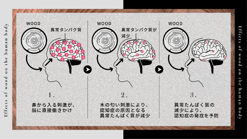 木の匂いに包まれることで脳内にある認知症の原因箇所に刺激を与え、認知症の発症を遅らせることができるのか、数種類の木材を用いて匂いの空間をつくり、動物実験を通じてその解明に向け、人のすまうくらしにこの知見を活用することを東京大学大学院理学系研究科 竹内研究室とともに目指します。