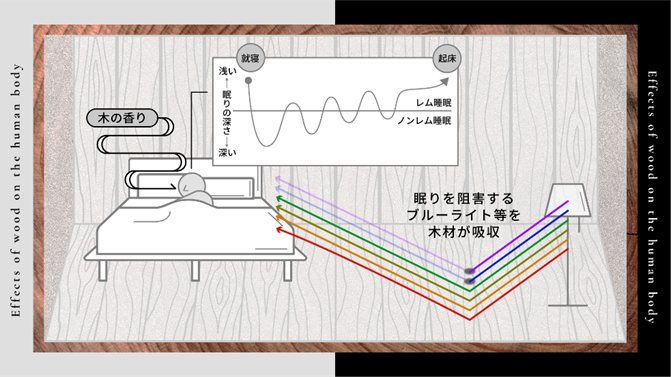 スギなどの樹種は、その特有の匂いによって人の副交感神経活動を優位にさせるため、呼吸数や心拍数を下げ、身体の回復や精神の鎮静化を導きます。また、睡眠を妨げるブルーライトなどの短波長の光を吸収しやすい性質があるため、木材を取り入れた空間の光環境は快眠を促せるのではないかと本研究では仮説を立てています。本研究では、数種類の木材を用いて樹種による効果の違いについて実験を行います。