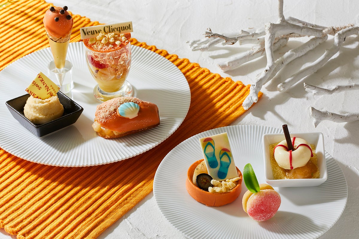ヴーヴ・クリコが持つ力強さ、フレッシュさからインスピレーションを受けた、夏のビーチリゾートを思わせる華やかなアフタヌーンティーには、旬の白桃をメインフルーツに爽やかなスイーツが揃います。砂の城をモチーフにした「アールグレイと白桃のムース」、レモンの酸味と白桃の甘みが絶妙にマッチした「レモンクリームと白桃のマドレーヌサンド」などに加え、白桃とシャンパンの風味が広がる「白桃とヴーヴ・クリコのコンポートジュレ」やヴーヴ・クリコのフレッシュな味わいをそのまま楽しめる「ヴーヴ・クリコシャーベット」、浮き輪の形が愛らしい「白桃のコンフィチュールとバニラのムース」などの7種類をご堪能ください。