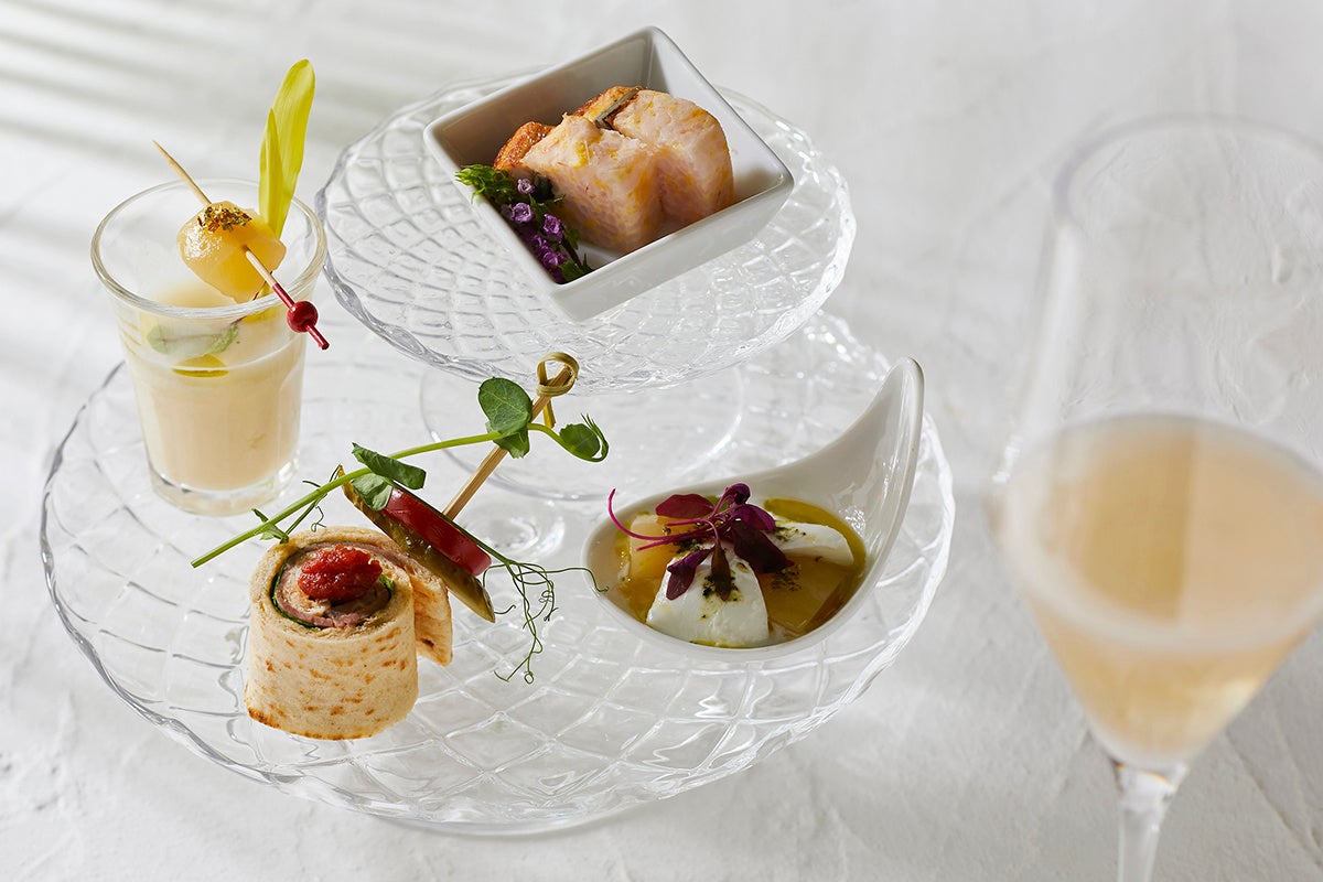 セイヴォリーではみずみずしい桃とモッツァレラチーズのカプレーゼをはじめ、ローストビーフとカクテルマヨネーズを薄く焼き上げた“ラバシュ”と呼ばれるパンで包んだ「ローストビーフ、ラバシュロールサンド」、桃の香り豊かな「桃とポテトのビシソワーズ」に、夏に嬉しいウナギを使用した押し寿司風テリーヌなど、季節感あふれる個性豊かな4品が彩りを添えます。