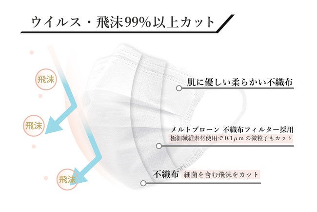 自社工場で製造を行う不織布マスクは、医療用レベルの高性能フィルターでウイルスや細菌の侵入を防ぎ、耳痛を防いでくれる幅広(6㎜)の耳紐を採用した安心・安全・毎日快適の高品質マスクです。さらに、クリーンルームでの徹底した品質管理・検品とマスク1枚1枚にUV除菌加工など、衛生面にまで力を入れております。