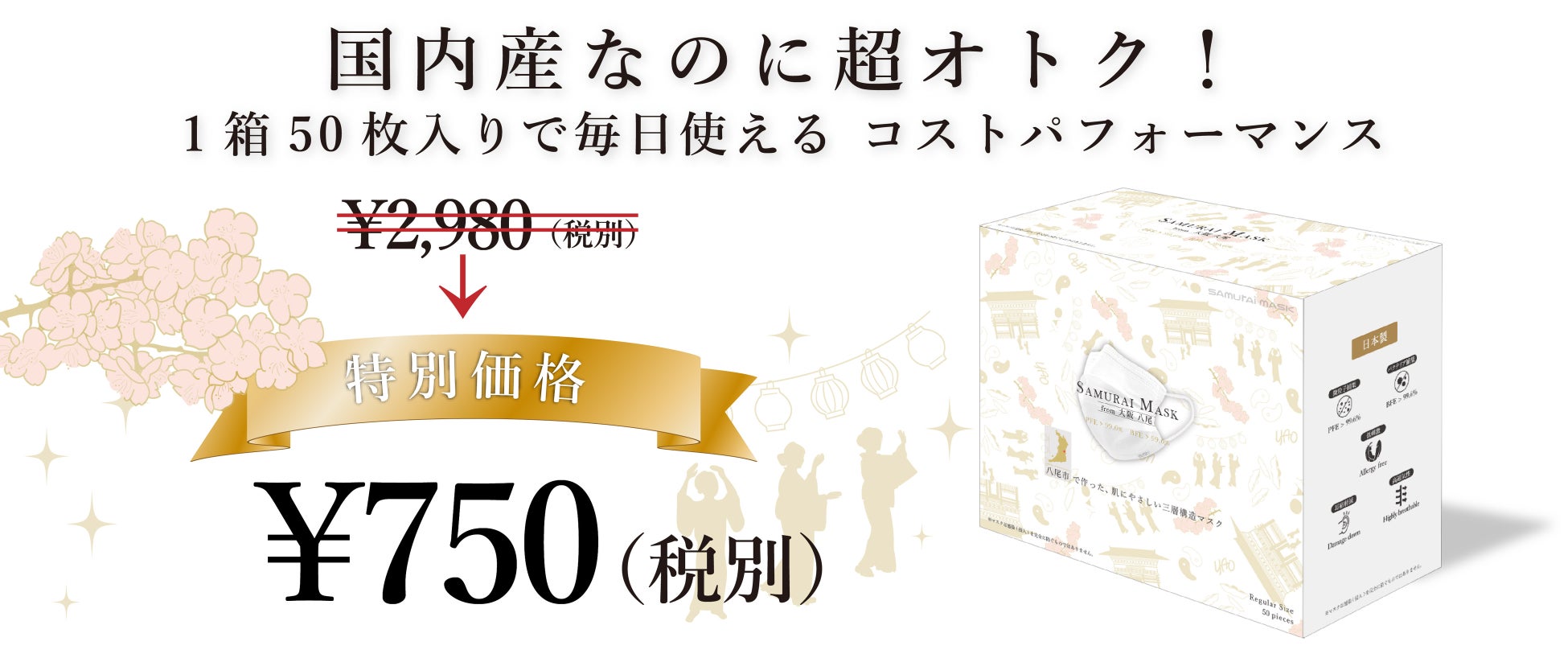 - 感染のリスクを抑えるために適切なマスクを選ぶことが重要だと思われます。そこで今回多くの方からご好評を頂いております、純国産で高機能・高性能の”SAMURAI MASK”を特別価格750円(税別)でご提供することを決定致しました。定価2,980円(税別)から75%OFFの大特価で、皆様に安心と安全をお届け致します。