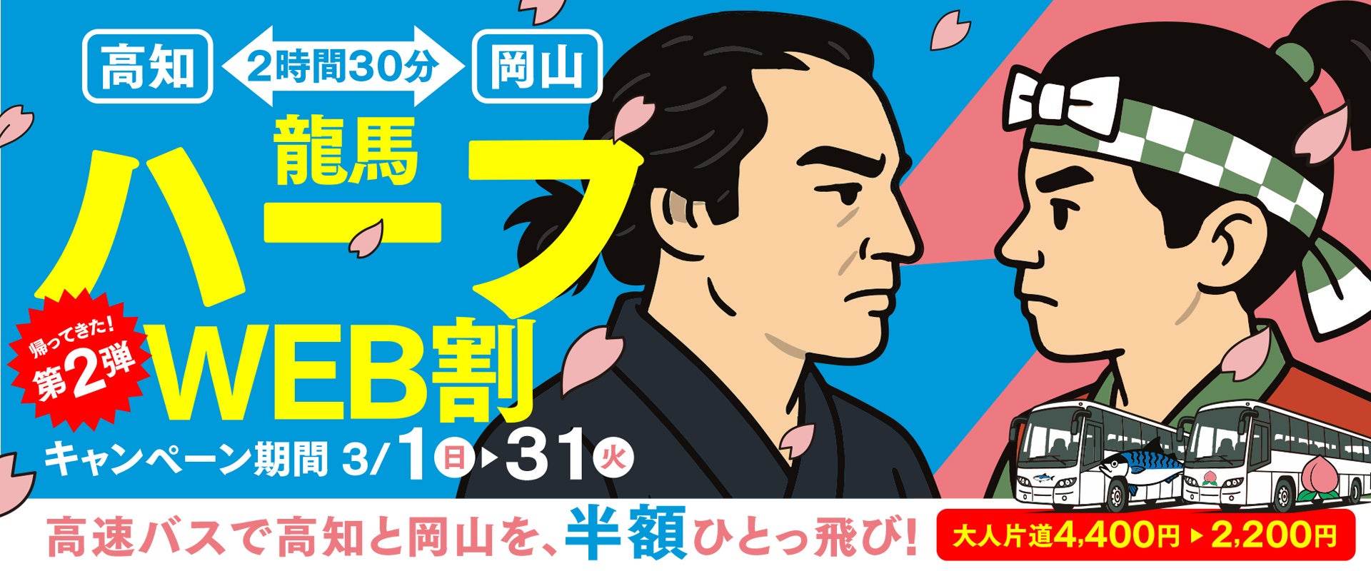 その“門出の季節”に、両備バスカンパニー(両備ホールディングス株式会社 社内カンパニー)は、下津井電鉄株式会社、ジェイアール四国バス株式会社、とさでん交通株式会社と共同運行する高速バス岡山~高知線において、2026年3月1日(日)~31日(火)の期間限定で片道運賃半額キャンペーン 「龍馬ハーフWEB割」 の第二弾を実施。