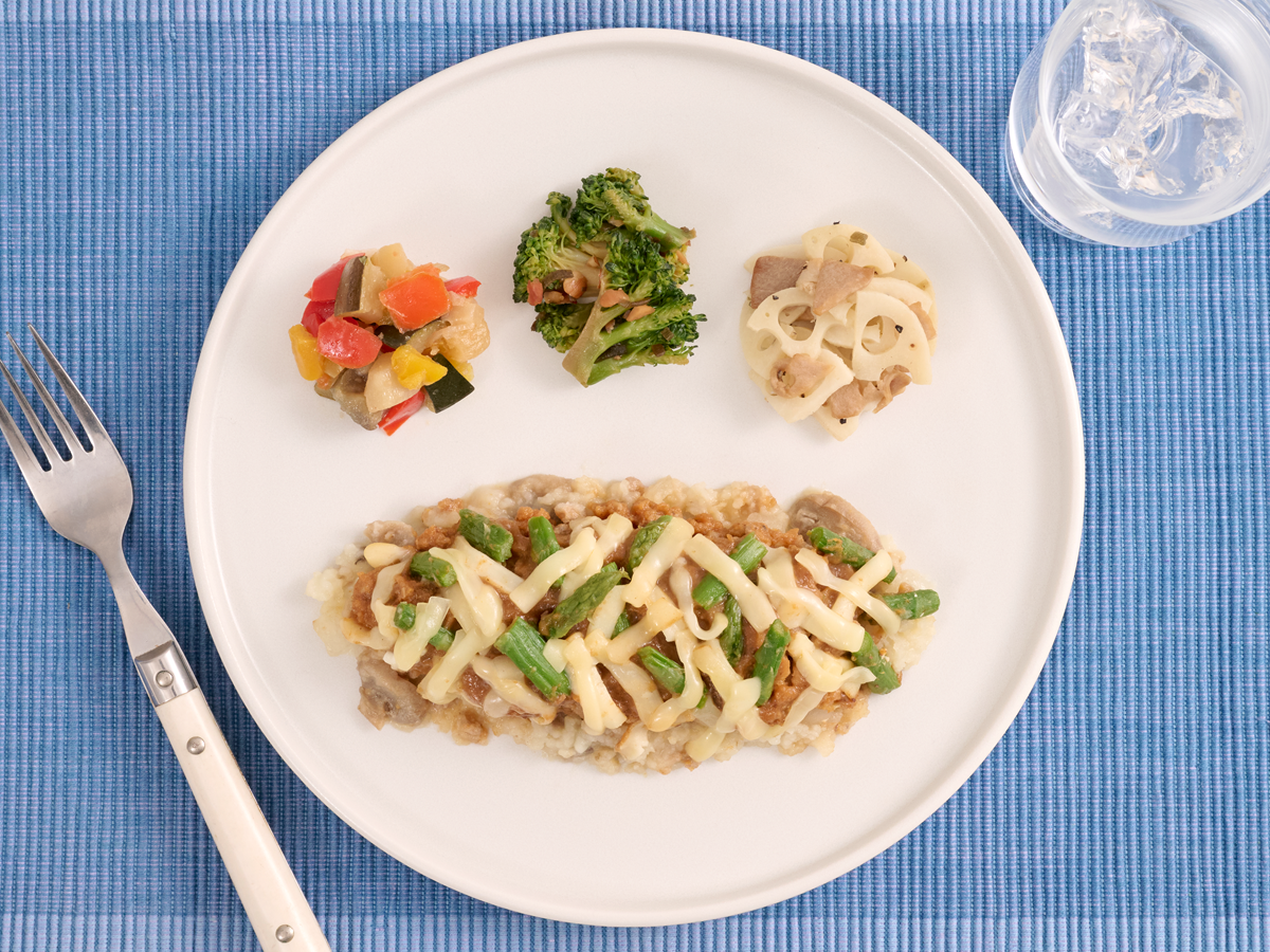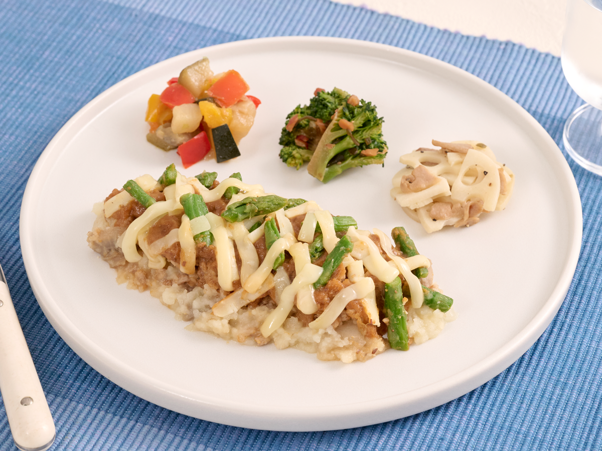 人気メニューのアッシ・パルマンティエのじゃがいも部分をマッシュポテトに変更し、さらに口溶け良く仕上げました!マッシュポテト、とろけるチーズ、トマトと牛肉ミンチの旨みが溶け込んだ濃厚な特製ソースがベストマッチ!たっぷりとすくって、頬張ってほしいメニューとなっております。