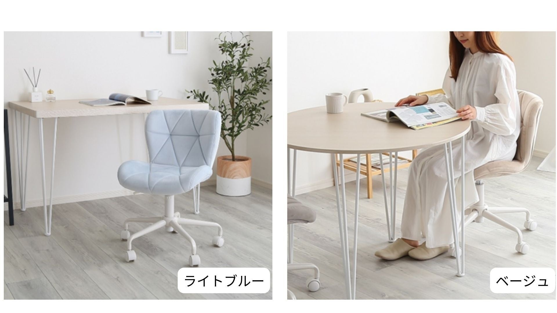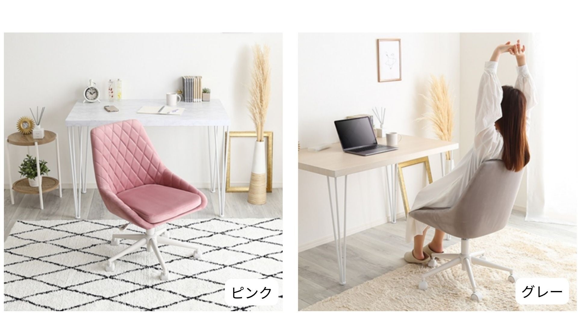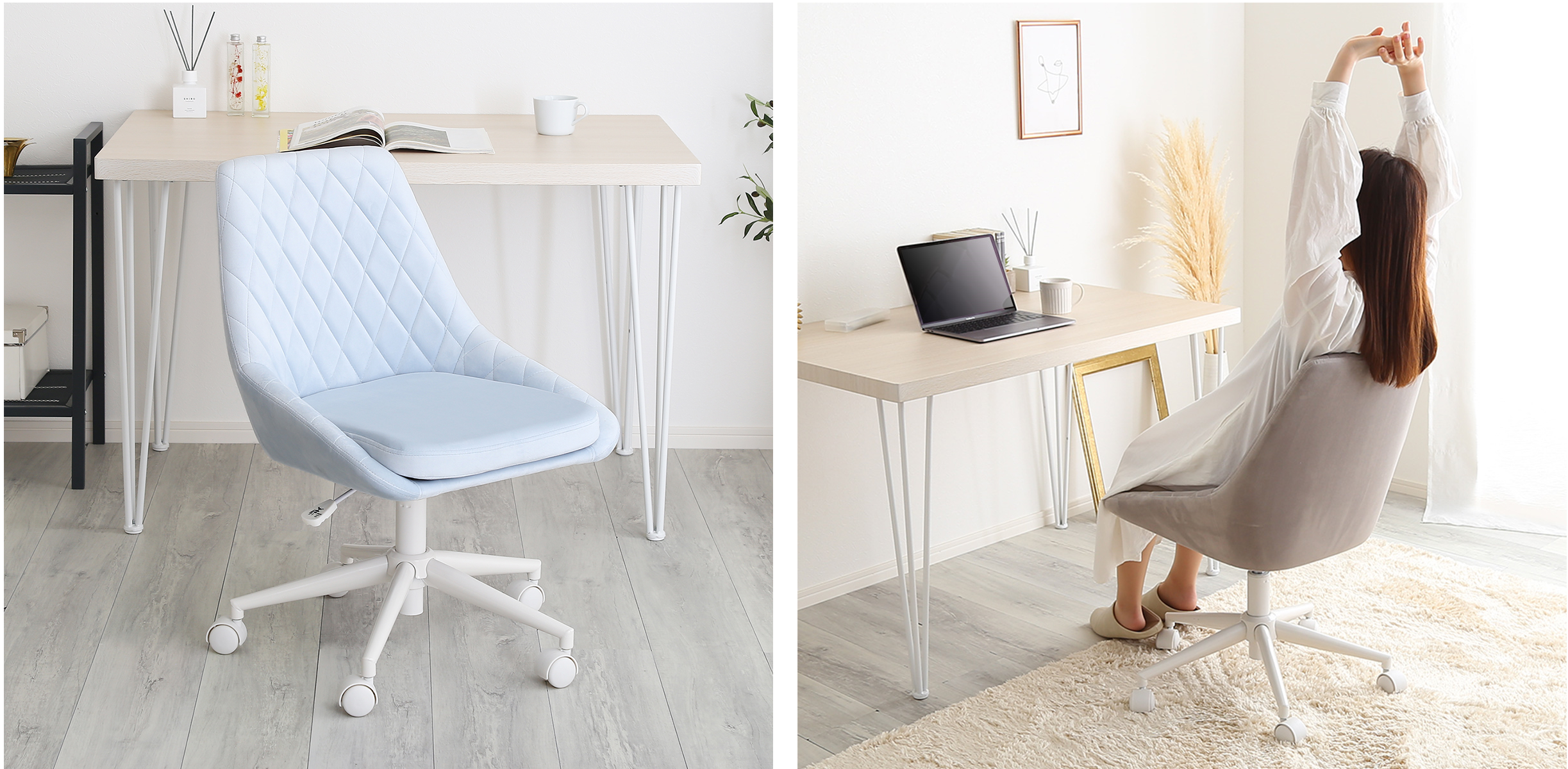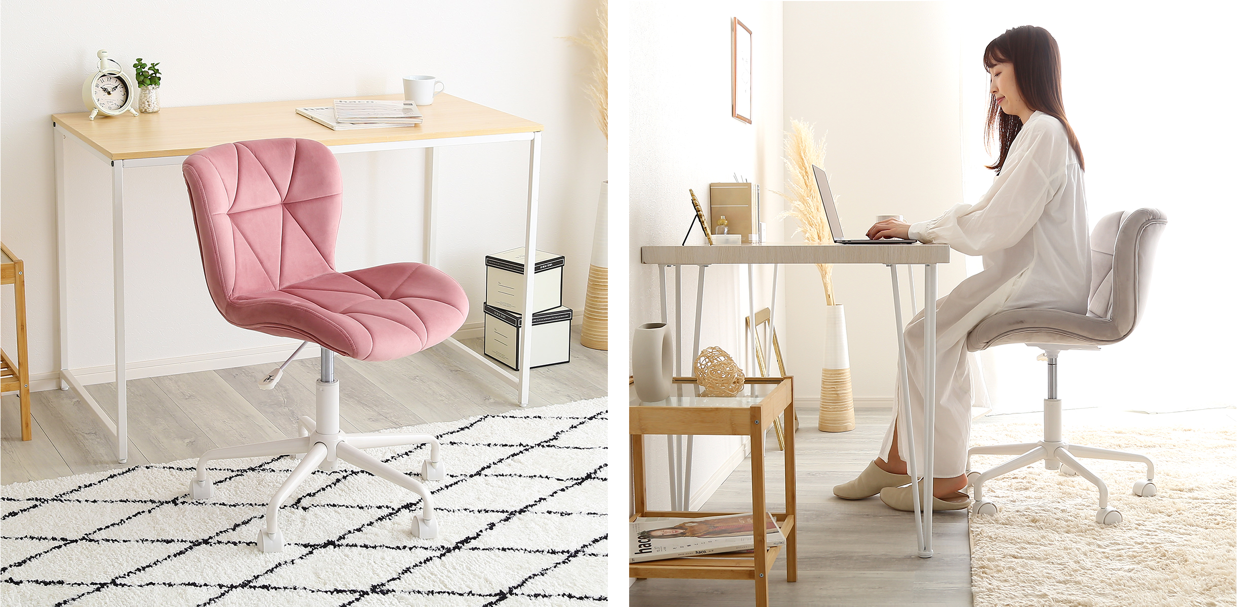 座面部分はくすみカラーで肌触りの良いスエード調の生地を採用。ピンク・ホワイト・ベージュ・グレー・ライトブルーの5色展開で、360°どこから見てもかわいいデザインです。各パーツの色にも徹底的にこだわり、脚やキャスター、支柱やレバーまで、オールホワイトで統一。大人かわいいテイストを追求しました。長時間座っても疲れにくいふかふかなウレタン座面を採用しておりデザイン性と機能性を兼ね備えたワークチェアです。ぜひニトリネットからお買い求めください。