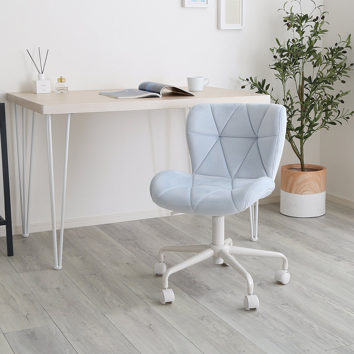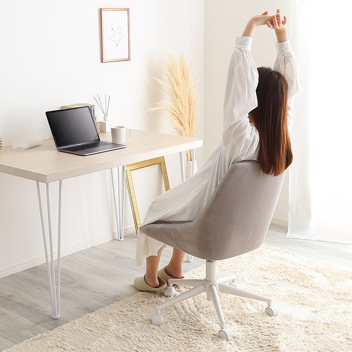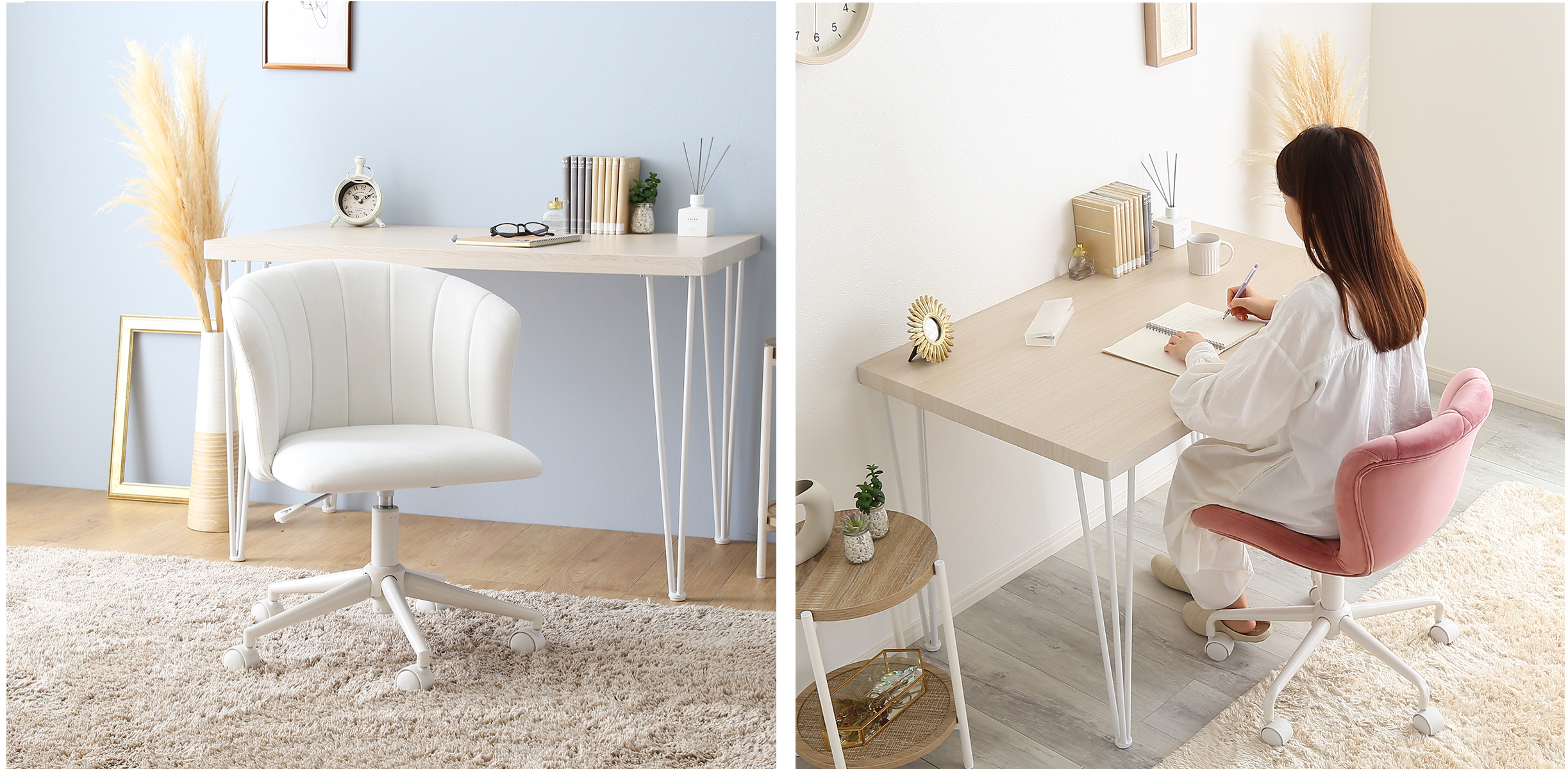 座面部分はくすみカラーで肌触りの良いスエード調の生地を採用。ピンク・ホワイト・ベージュ・グレー・ライトブルーの5色展開で、360°どこから見てもかわいいデザインです。各パーツの色にも徹底的にこだわり、脚やキャスター、支柱やレバーまで、オールホワイトで統一。大人かわいいテイストを追求しました。長時間座っても疲れにくいふかふかなウレタン座面を採用しておりデザイン性と機能性を兼ね備えたワークチェアです。ぜひニトリネットからお買い求めください。