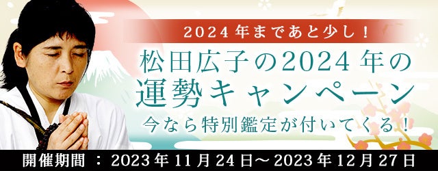 松田広子の公式占いサイト「恐山の秘術【最後のイタコ】松田広子」では、『2024年の運勢キャンペーン』を開催中です。本キャンペーンでは、もうすぐ迎える2024年を素晴らしいものにしていただきたいという想いから、2024年の運勢を占う鑑定を多数ご用意いたしました。更に日頃サイトをご利用いただいている皆様へ、感謝の気持ちを込めまして、期間中対象の鑑定を占っていただいた方に「特別鑑定」をお贈りいたします。期間限定のキャンペーンとなっておりますので、皆様この機会に是非ご参加ください。