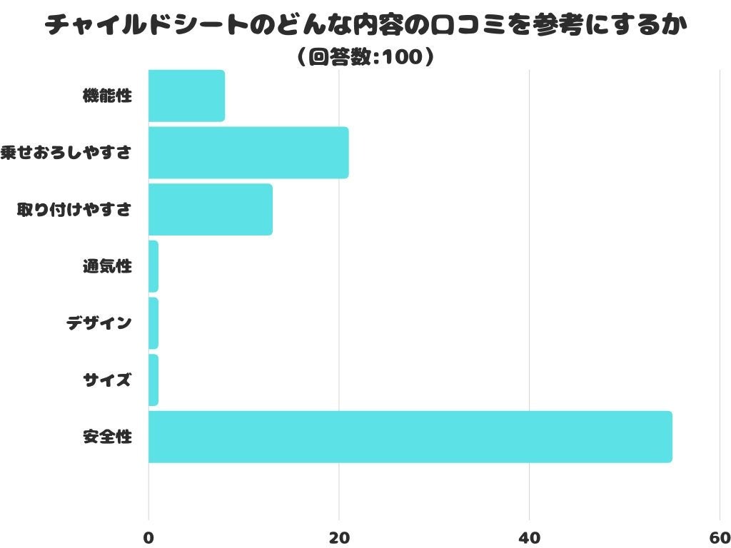 チャイルドシートのどんな内容の口コミを参考にするかをアンケートにて調査したところ、1位は「安全性」でした。