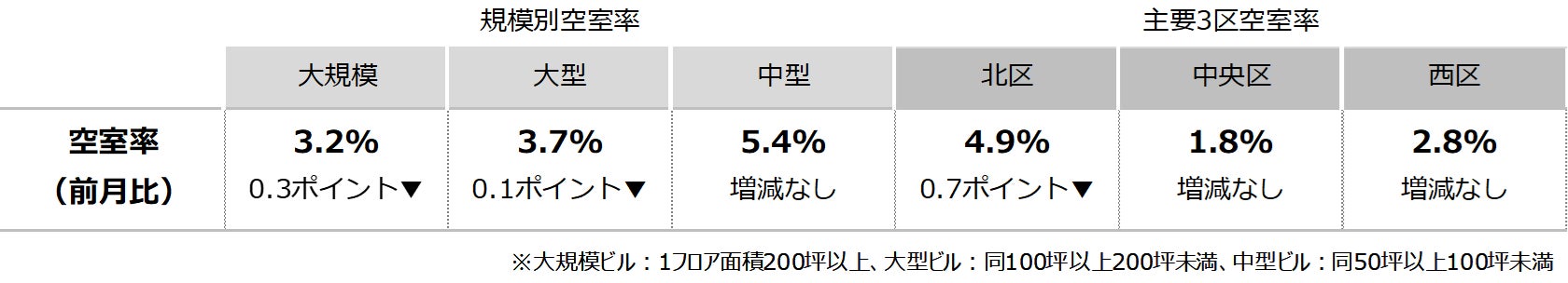 空室率は前月比マイナス0.29ポイントの3.18%となり、3ヵ月連続の低下となった。新築・築浅ビルを中心に空室消化が進み、主な低下要因となっている。エリア別では「北区」が前月比マイナス0.7ポイントと大幅に低下した。潜在空室率は前月比マイナス0.27ポイントの4.87%となった。