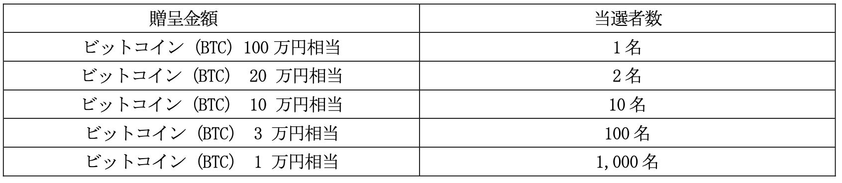 対象となる株主の皆様の中から、抽選により以下のとおり総額 15.4 百万円相当のビットコイン(BTC)を贈呈いたします。