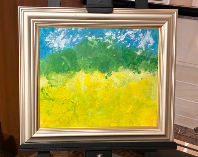 鮮やかな黄色と緑、そして青空が印象的な本作は、作者が父親と訪れた思い出の風景を描いたもの。スポンジを足の裏につけて描くという独自の技法により、ダイナミックで温もりのある表現が生まれています。