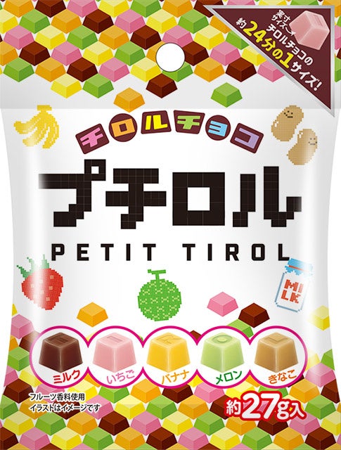 2020年に登場した、台形型はそのままに1粒の大きさが24分の1(※)になった、カラフルで可愛らしいフォルムのチロルチョコ。小さなお子様でも食べやすいプチサイズです。ミルク、いちご、バナナ、メロン、きなこの5種類が1袋で楽しめます。※当社バラ売り製品との比較