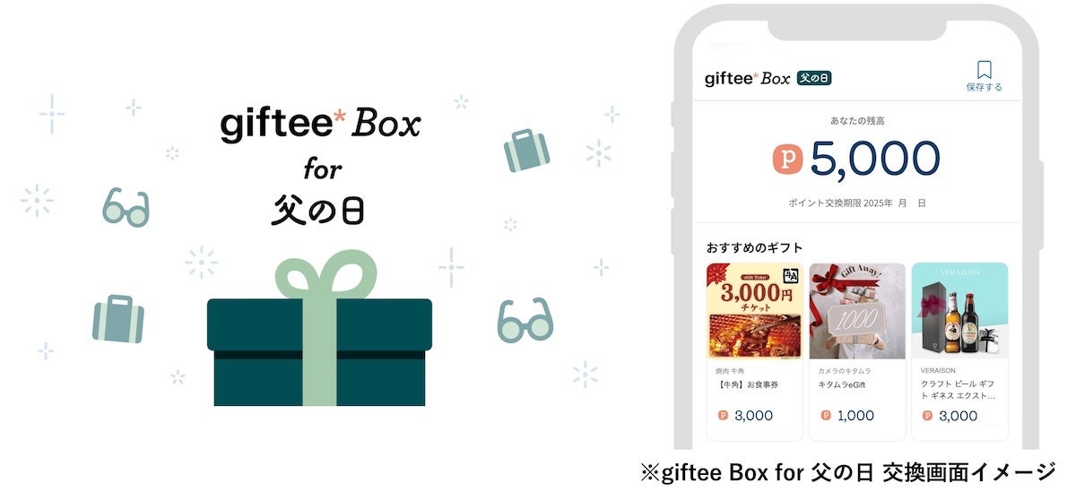 毎年ご好評いただいている、父の日をテーマにピックアップした豊富なギフトの中から、受け取り手であるお父さんが商品を選べるデジタルギフトボックス「giftee Box for 父の日」の販売を5月29日(木)より開始いたしました。また、2025年の父の日は、「お父さんの明日のエネルギーをチャージ!」をテーマに、暑い夏に向けてお父さんにパワーをチャージしてもらえるような、プチ贅沢グルメや旅行ギフトなどの商品を取り揃えた父の日ギフト特集ページを公開しておりますので、ギフト選びにお悩みの方はぜひご活用ください。