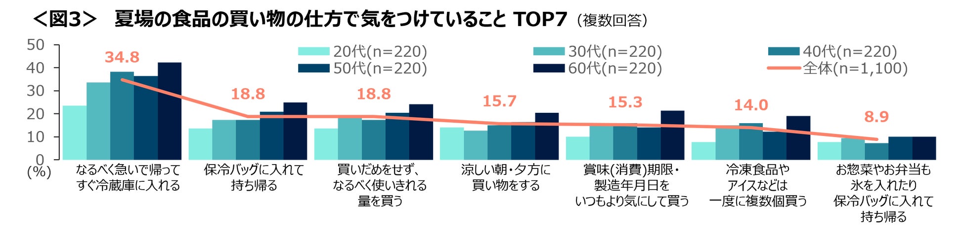 夏場の食品の買い物で気をつけていることは、「なるべく急いで帰ってすぐ冷蔵庫に入れる」が34.8%で最も高く、「保冷バックに入れる」「使いきれる量を買う」が18.8%で続き、特に60代で高い。<図3>