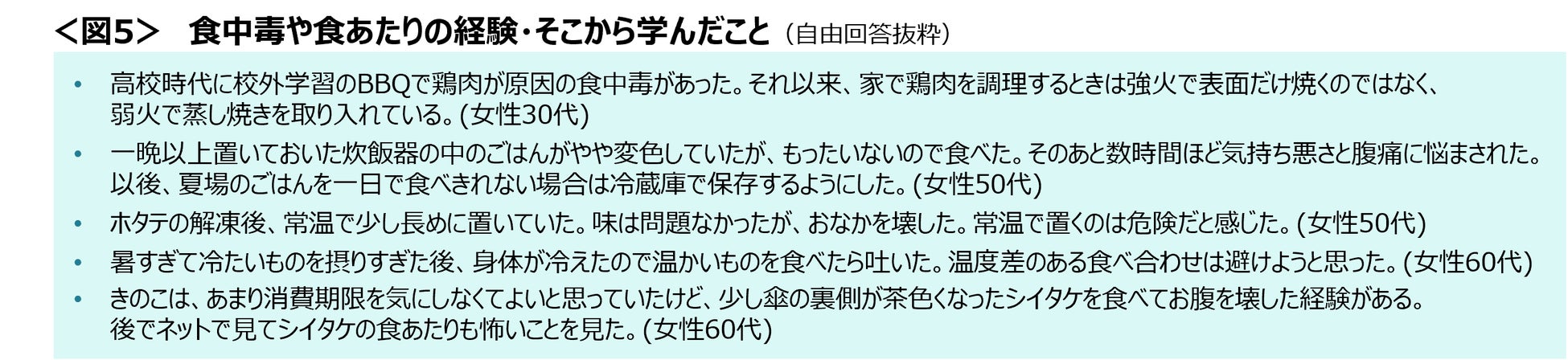 食中毒・食あたりの経験は、生焼けの肉や古い食材、常温で放置したものなどが原因としてあげられる。「蒸し焼きにしてよく火を通す」「冷蔵で保存する」といった基本的な対策が重要であることを感じている。<図5>