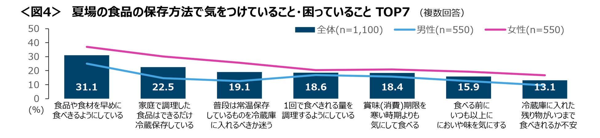 夏場の食品の保存で気をつけていること・困っていることは、「食品や食材を早めに食べきる」「できるだけ冷蔵保存している」で2~3割台。<図4>
