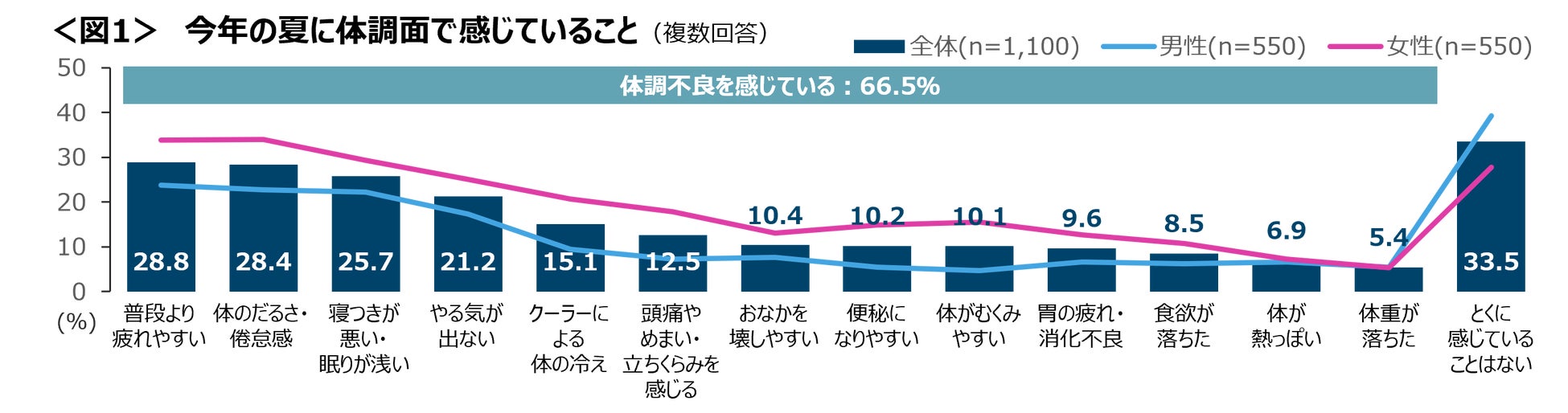 今年の夏、「体調不良を感じている」人は66.5%で、「普段より疲れやすい」「体のだるさ・倦怠感」「寝つきが悪い・眠りが浅い」が上位。