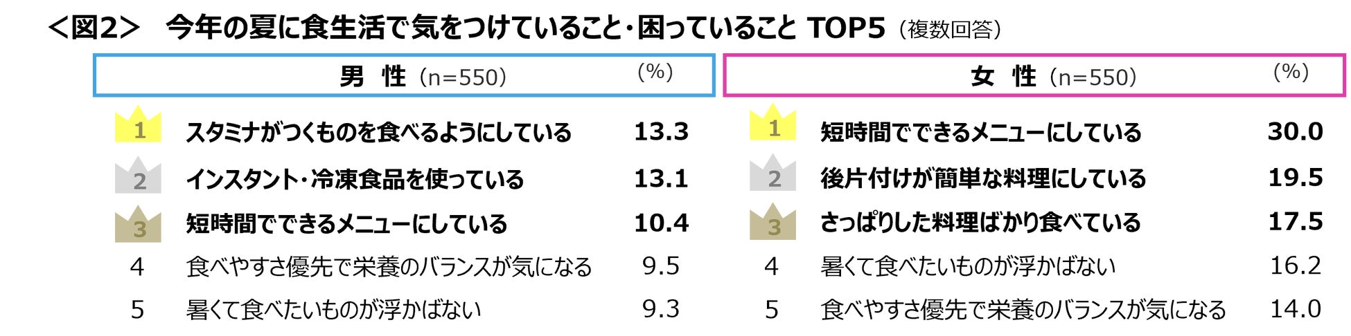 今年の夏に食生活で気をつけていることとして、男性は「スタミナがつくものを食べる(13.3%)」「インスタント・冷凍食品を使っている(13.1%)」、女性は「短時間でできるメニューにしている(30.0%)」がトップ。