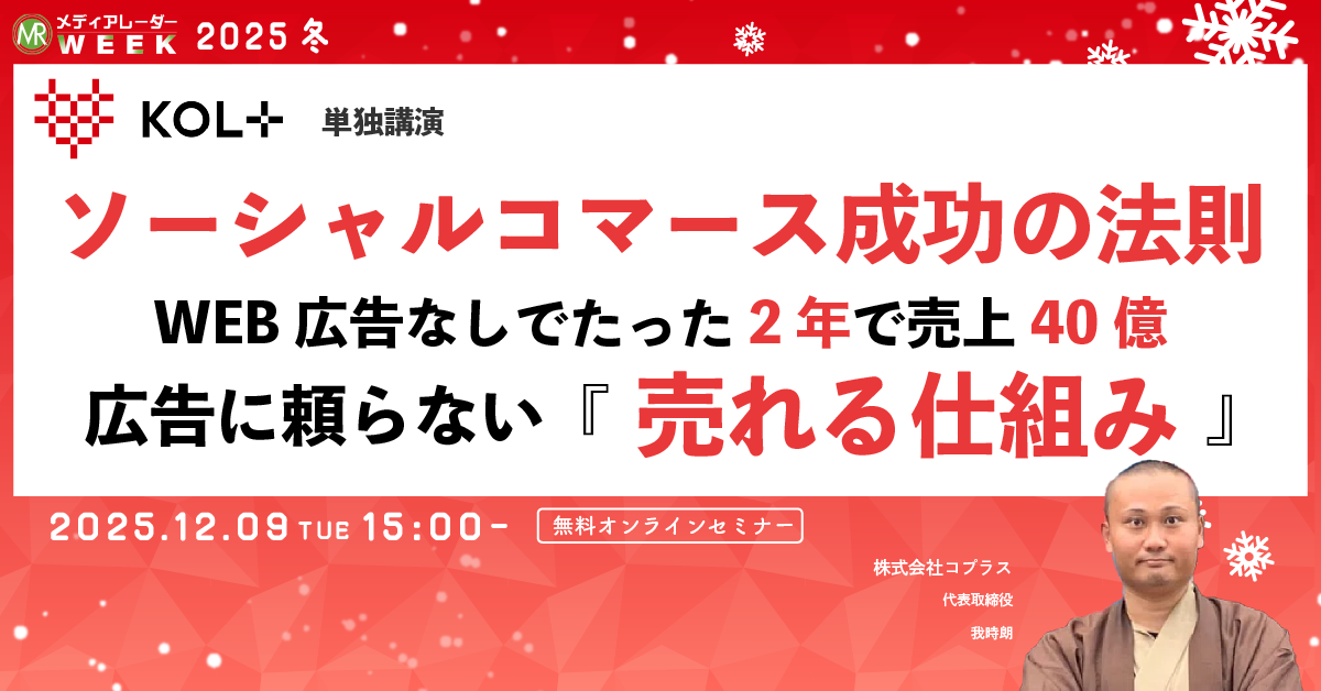 株式会社アイズ(所在地:東京都渋谷区、代表取締役社長:福島範幸、東証グロース:5242)が運営するNo.1*の広告業界のプラットフォーム「メディアレーダー」が主催するマーケティングセミナーイベント「第20回メディアレーダーWEEK 2025 冬」にて、株式会社コプラス様が12/9(火)に登壇します。視聴申し込みは無料です。