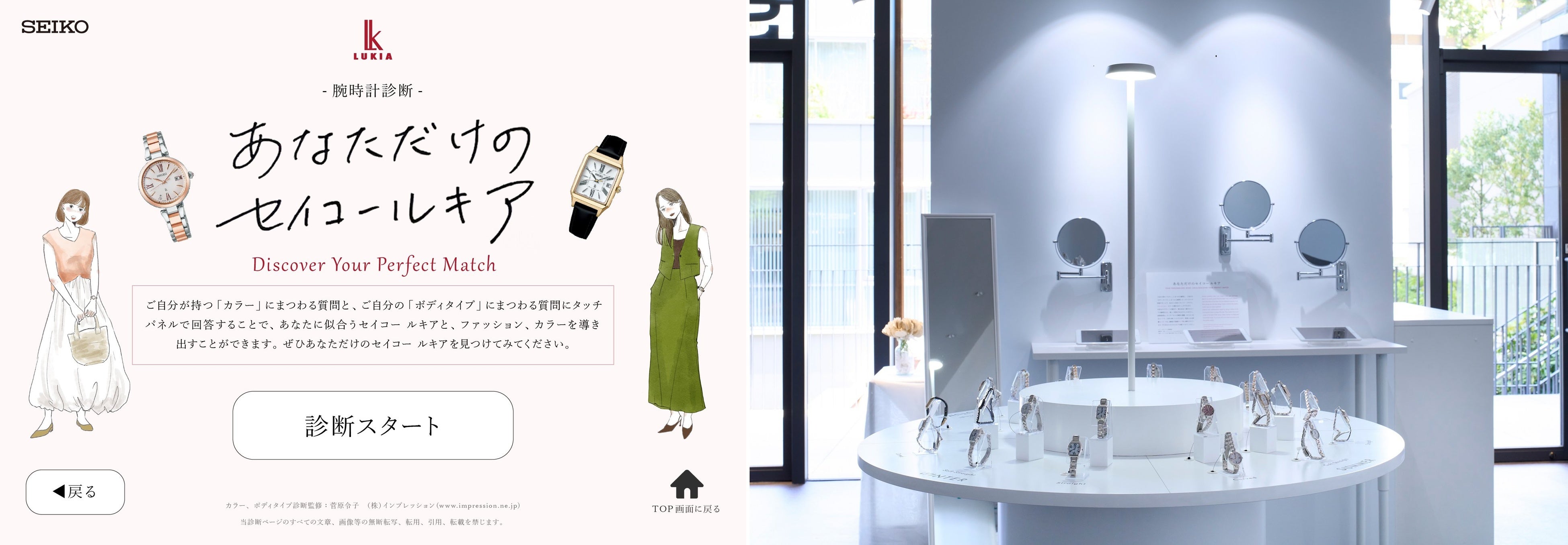 試着コーナーでは、9つの質問から来場者に似合う腕時計とファッションを導き出す診断「あなただけのセイコー ルキア」をご用意しています。これはカラーイメージコンサルタントの菅原 令子氏の監修によるもので、お好みのデザインの傾向や、実は似合う意外なタイプの腕時計など、楽しい発見があるかもしれません。