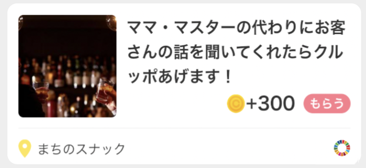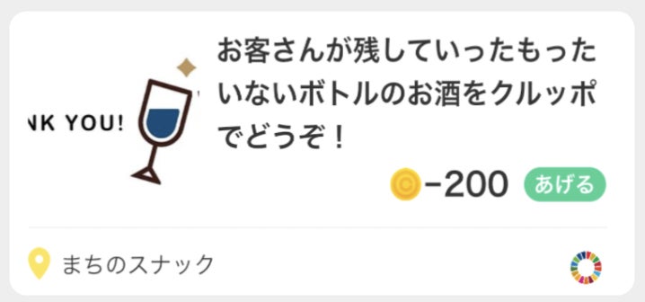 鎌倉市の「SDGsつながりポイント」で活用されているコミュニティ通貨「まちのコイン」を利用して、お客様同士の交流やお得な体験ができます。例えば、「ママ・マスターの代わりにお客様の話を聞く」や「スナックのお手伝い」をすることで、クルッポ(鎌倉での通貨名)を獲得できます。また、獲得したクルッポを使って、お客様が飲み残してお店に寄付してくれたキープボトルから、1杯200クルッポで飲むことができます。