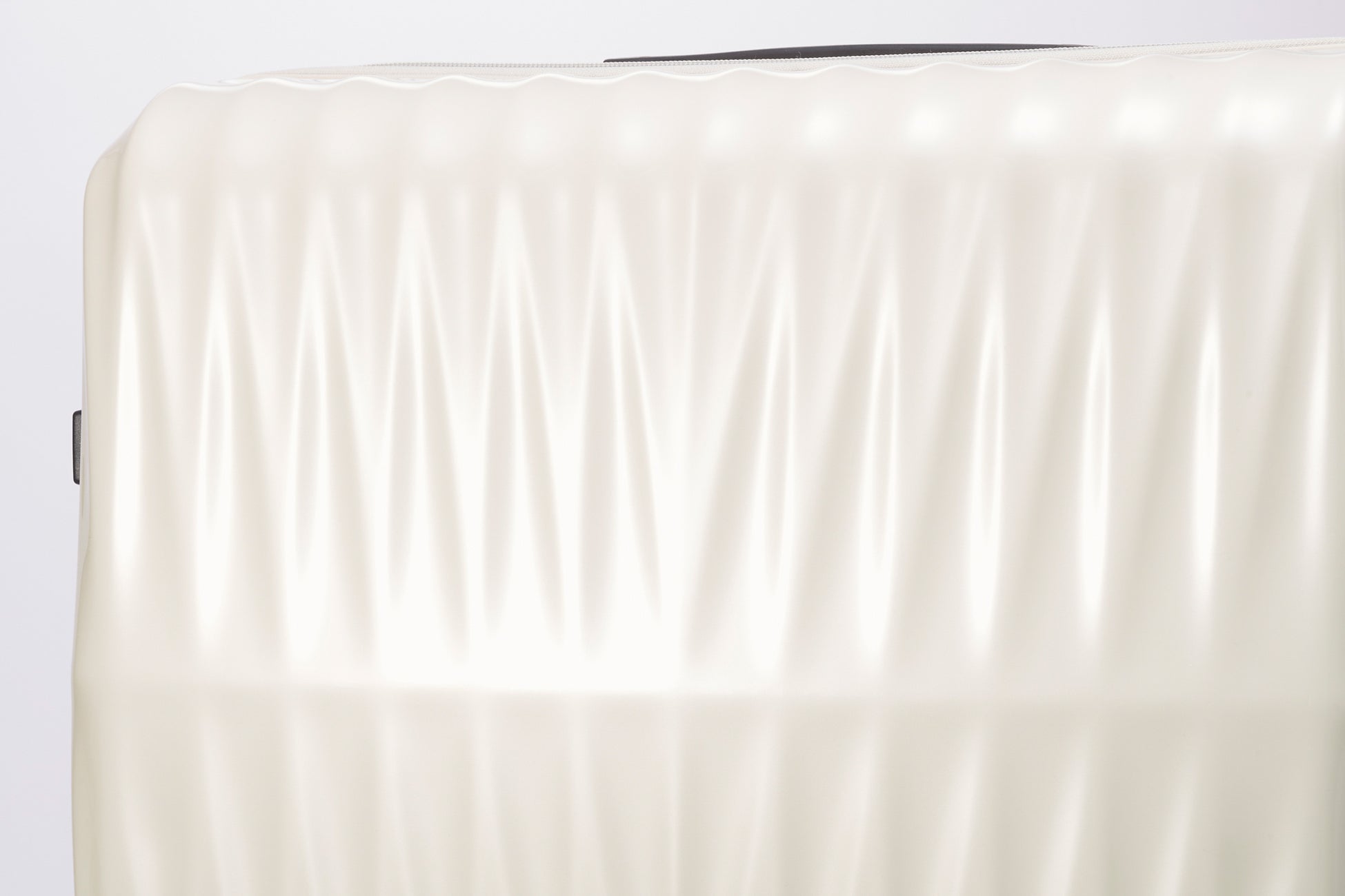 水より比重の軽いポリプロピレン樹脂を採用し、機内持込サイズ2.2kgを実現しました。強度を付与するリブデザイン(ボディ表面の凸凹)を三軸方向に張り巡らすことで、軽さと耐久性を両立させています。