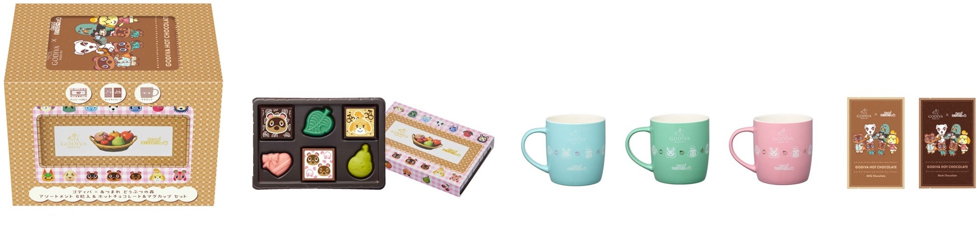 ゲームの登場キャラクターなどをデザインした限定チョコレートのアソートメント「ゴディバ × あつまれ どうぶつの森 アソートメント 6粒入」や「ゴディバ × あつまれ どうぶつの森 アソートメント 9粒入」をはじめ、コラボレーションオリジナルデザインのポーチが付いた「ゴディバ × あつまれ どうぶつの森 アソートメント 6粒入 オリジナルポーチつき」や、オリジナルデザインのマグカップとミルク、ダーク 2種類のホットチョコレートをセットにした「ゴディバ × あつまれ どうぶつの森 アソートメント 6粒入 &ホットチョコレート&マグカップ セット」をご用意しました。