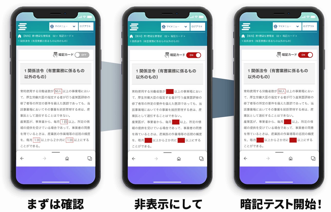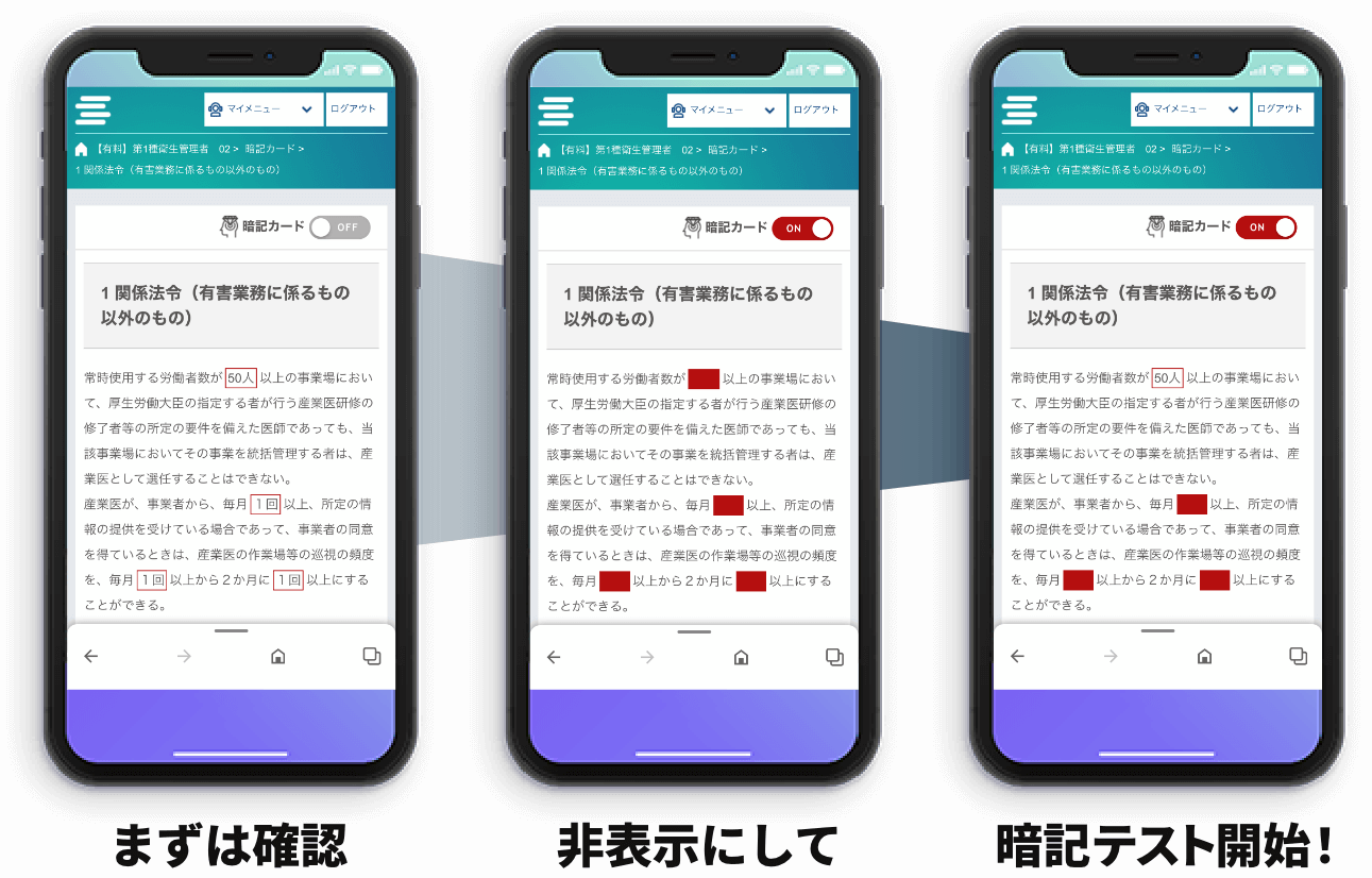 スマホでタップするだけで隠れている箇所が表示されますので、わざわざ重い参考書を持ち運ばなくても繰り返し学習ができます。