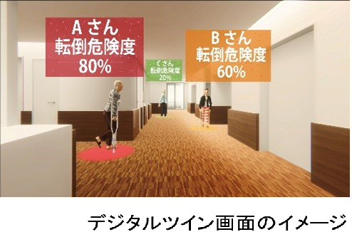 過去のデータから入院患者の転倒・転落リスクを分析し、分析結果をデジタルツインに重ね合わせて情報発信。看護師が当該情報を事前に確認することで事故防止につなげる。