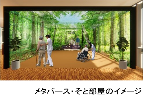病棟のデイルームにメタバースも体験できる「そと部屋」を設置。室内空間に外部空間の心地よさを取り入れることで、建築環境による認知症患者のQOL(生活の質)の向上およびリハビリへの効果が期待される。
