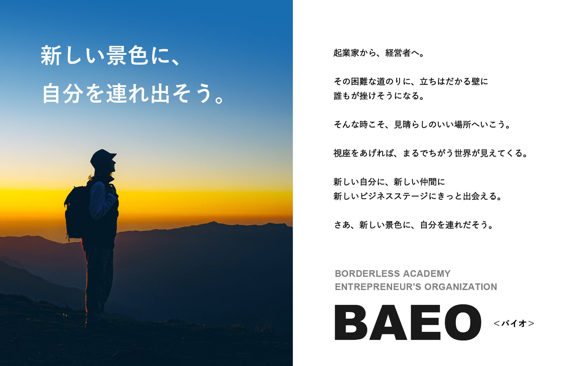 BAEOは、単なるコミュニティにとどまらず、社会課題解決に挑む起業家や経営者が互いに切磋琢磨しながら事業成功を目指す共創の場です。共に学び、共に成長しながら、本気で社会にインパクトを創出していく、そんな新しい景色を参加者の皆さんとともに目指して一歩ずつ進んで参ります。