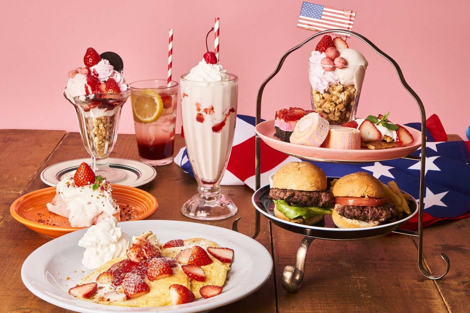 「いちごのアフタヌーンティープラン」は、写真映えする2段スタンドにストロベリーサンデーやストロベリージュレケーキなどのスイーツと、ミニハンバーガーやフライドポテトなどのお食事が並び、別皿でストロベリーパンケーキをご提供いたします。また、ドリンクはストロベリーシェイクやストロベリーレモネードなどの限定ドリンクや定番のカフェラテ、ロイヤルミルクティー、ソフトドリンクなども含む全20種類以上の中からお好きなものを何杯でもお召し上がりいただけます。