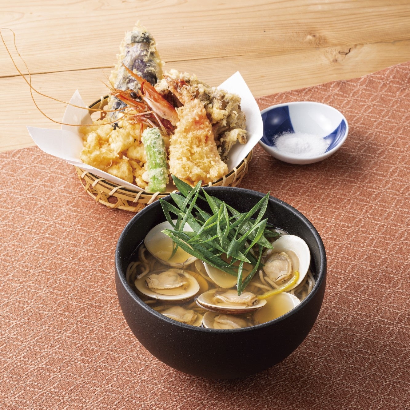 そばが見えない程に盛りつけた蛤と、しじみと蛤の出汁が香るそばに九条ねぎを添え、揚げたての天ぷらを一度に楽しめる今だけしか味わえないセットメニューです。