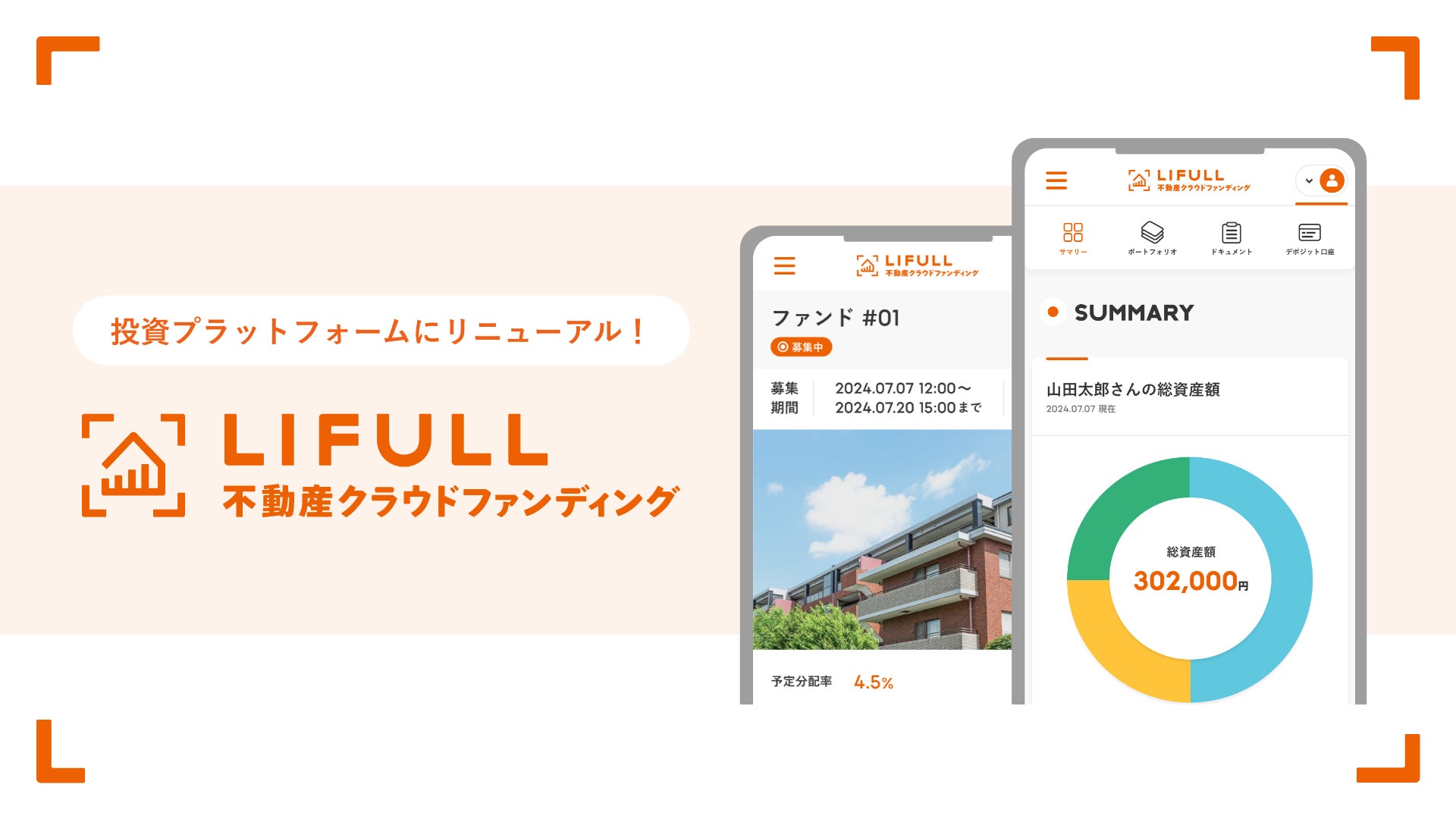 事業を通して社会課題解決に取り組む株式会社LIFULLのグループ会社である株式会社LIFULL Investment(本社:東京都千代田区、代表取締役社長:市川和也)は、不動産特定共同事業の許可(第2号・第4号)に基づいた不動産ファンドの募集プラットフォームサービス「LIFULL 不動産クラウドファンディング」(以下、本サービス)をリニューアルオープンいたします。本サービスは、不動産特定共同事業の許可(第2号・第4号)に基づいた不動産クラウドファンディング事業としては、不動産特定共同事業者(第1号・第3号)が運営するファンドの募集をワンストップで行う、不動産クラウドファンディング業界初のプラットフォームサービスとなります。(2024年6月11日時点、当社調べ)